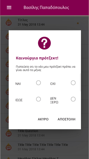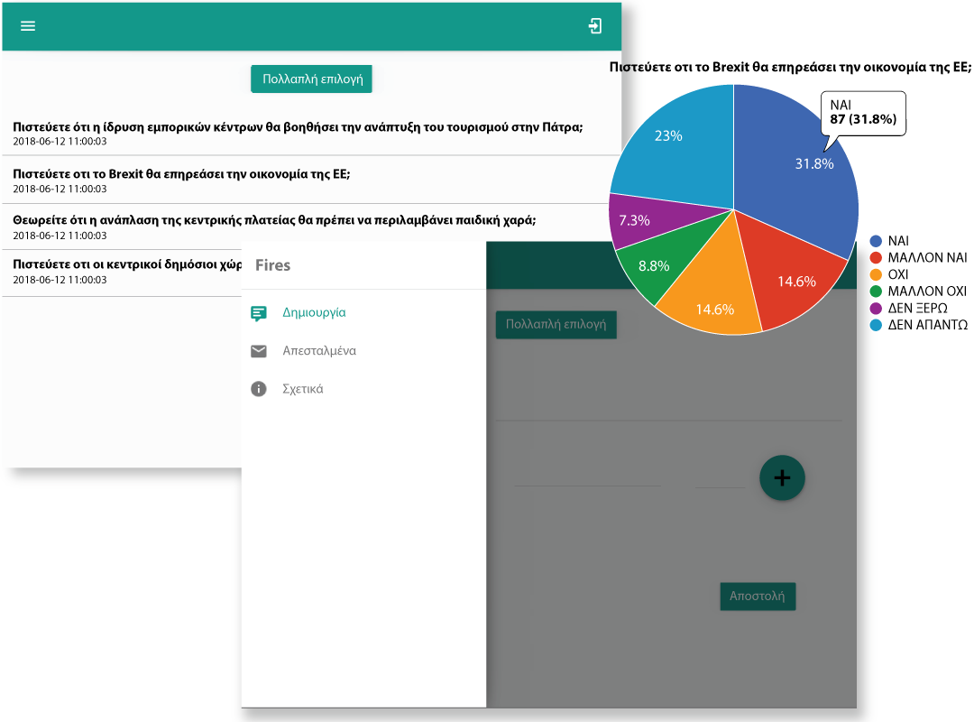 Μέσω της admin εφαρμογής μπορείτε να στέλνετε διάφορους τύπους ερωτήσεων (βαθμολόγησης, “ναι/όχι” και πολλαπλής επιλογής). Οι απαντήσεις συγκεντρώνονται και αναλύονται σε γραφικές παραστάσεις ανάλογα με τα δημογραφικά τους στοιχεία (ηλικία, φύλο, τοποθεσία) για να έχετε πλήρη και ορθή εικόνα. Αποκτάτε έτσι ένα μοναδικό πλεονέκτημα: την δυνατότητα να αφουγκράζεστε σε πραγματικό χρόνο το κοινό σας!